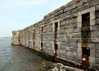 On January 17, 1861, Fort Schuyler was garrisoned by engineers who occupied it until 1865, when it was turned over to artillerymen. During the Civil War, Fort Schuyler was also used as a prison to hold Confederate soldiers who were captured. It was during this time that the McDougall General Hospital at the fort, which was first built in 1862, was destroyed by fire. In 1868, the fort’s defenses were further enhanced with the addition of ten Rodman guns which were mounted in casemates on the first tier and these in turn were replaced later by eight-inch rifles. A medical report for 1868-1869, written by Assistant Surgeon C.B. White, who served in the fort’s hospital, contains a description of life at the post in that period. Officers and enlisted men lived in the casemates, the troops being quartered in eight rooms arranged in two tiers. Three windows in the rear, two windows and a door in front, and shutters over each ventilated the quarters so well that, despite the two fireplaces in each room, Surgeon White said, “to warm them properly in severe winters it has been necessary to revert to stoves.”